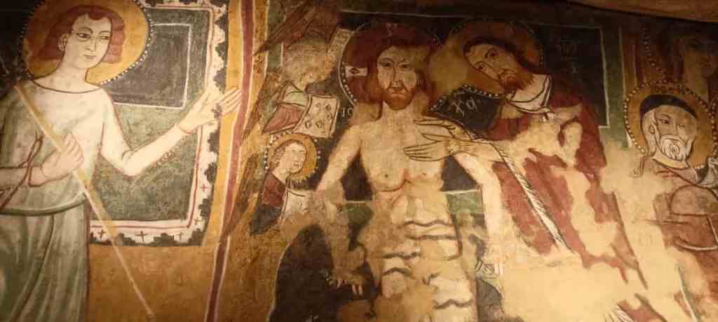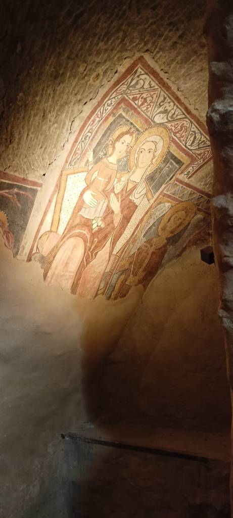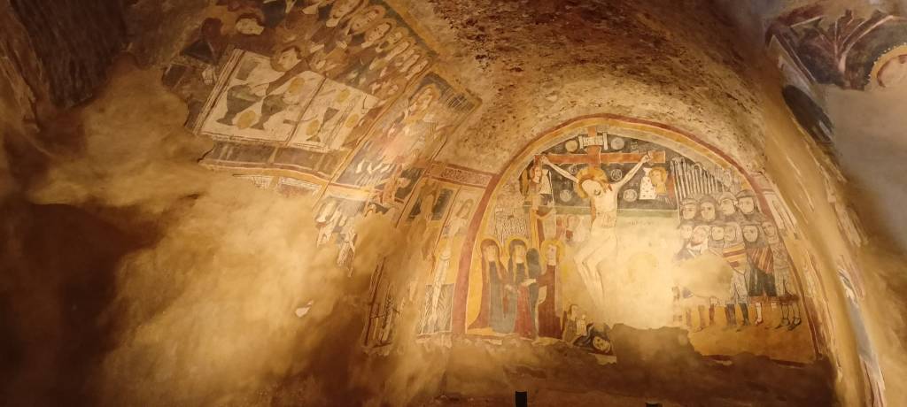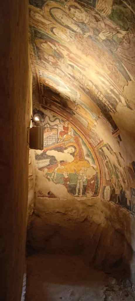 La chiesa conserva al suo interno un ciclo di affreschi unico nel suo genere. Risalenti alla terza e quarta decade del secolo XIV, le decorazioni riguardano l’intera vita di Cristo e della Vergine e coprono le pareti di una grotta (una navata e due bracci laterali) cui si accede attraverso l’edificato per mezzo di due archi. Le rappresentazioni hanno sicuramente influenze bizantine, ma attingono anche dalla tradizione popolare.