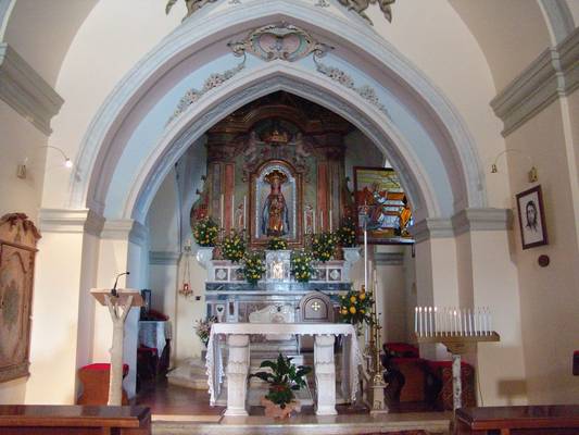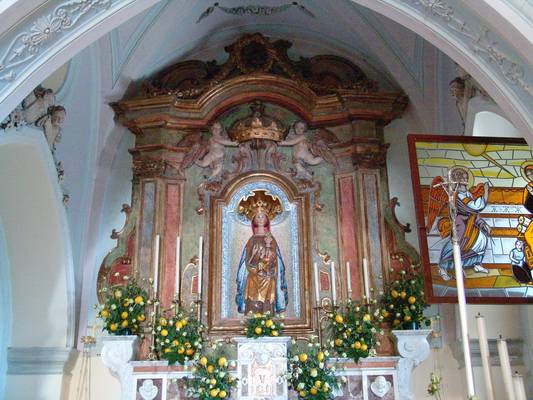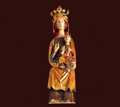 All’interno dell’edicola, si trova una statua lignea della Vergine policroma del XIV secolo, raffigurante la Madonna in trono, che con il braccio sinistro regge il Bambino e con il destro stringe un pomo andato perduto. Il piccolo Gesù benedice con la mano destra, mentre con la mancina impugna uno scettro. La statua è molto particolare in quanto rappresenta un perfetto connubio tra gli stili romanico e gotico.