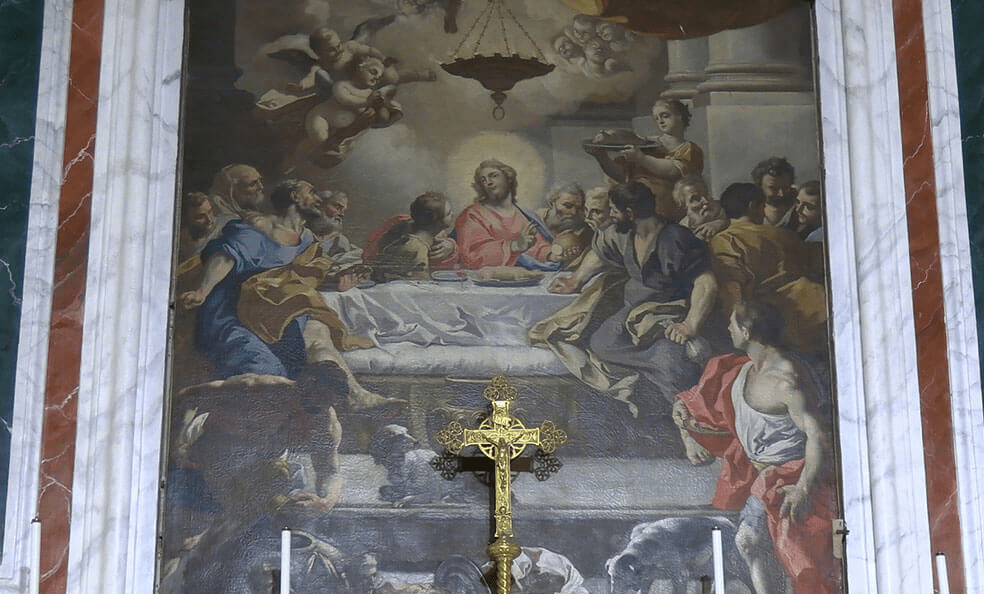 Durante i primi restauri della chiesa venne alla luce uno splendido arco di pietra, con sculture in rilievo. Esso si ipotizza che avrebbe costituito l’antico portale della chiesa prima dell’ampliamento della navata. All’interno di esso vi è una grande tela raffigurante l’Ultima Cena, opera del pittore Andrea Giannico. Sopra il quadro vi è una interessante epigrafe che recita: