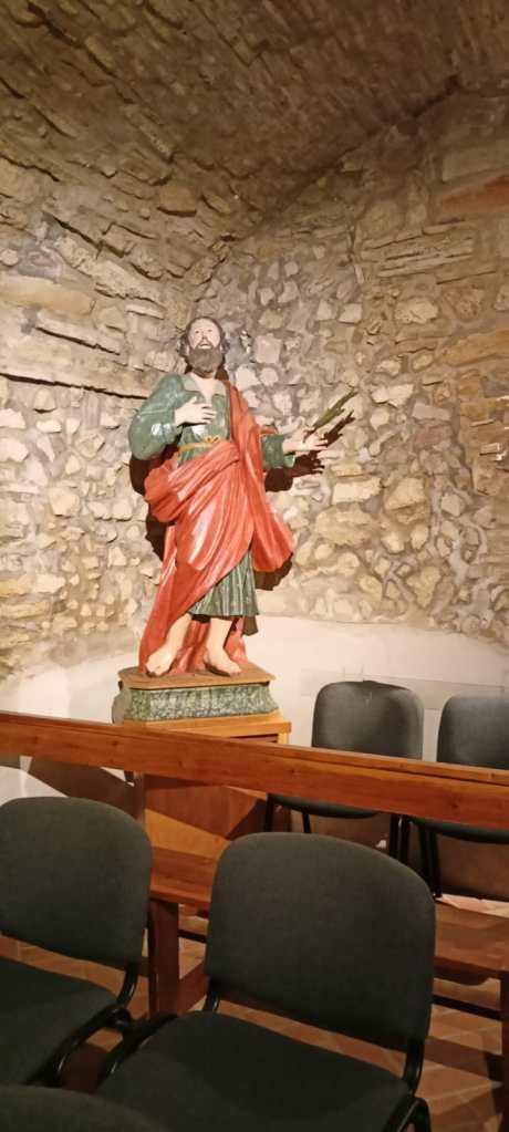 Nel presbiterio, di fianco all’altare, a destra, vi è una lapide che ricorda la data dell’11 Maggio 1659: la dedica della Chiesa ai SS. Pietro e Paolo, sotto il pontificato di Alessandro VII. Nel presbiterio, nucleo originario dell’edificio, vi è anche un’altra lapide che ricorda un’altra consacrazione, quella dell’altare maggiore, avvenuta nel 1740. Particolari straordinari e testimoni di vicende che si perdono nel corso nei secoli ma permettono di delineare la storia di questa piccola perla. Nell’abside sono contenute le statue lignee dei santi.