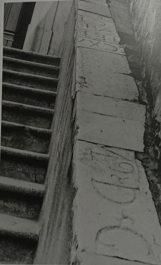 La scalinata della chiesa ha la balaustra rivestita di lastre di pietra che conservano i resti di epigrafi, alcune di origine medievale. Tradizione paesana ricorda che i ragazzini del paese avevano l’abitudine di scivolare lungo la balaustra. La mole possente e molto articolata dell’edificio crea un complesso notevole che dominava su tutto il paese.