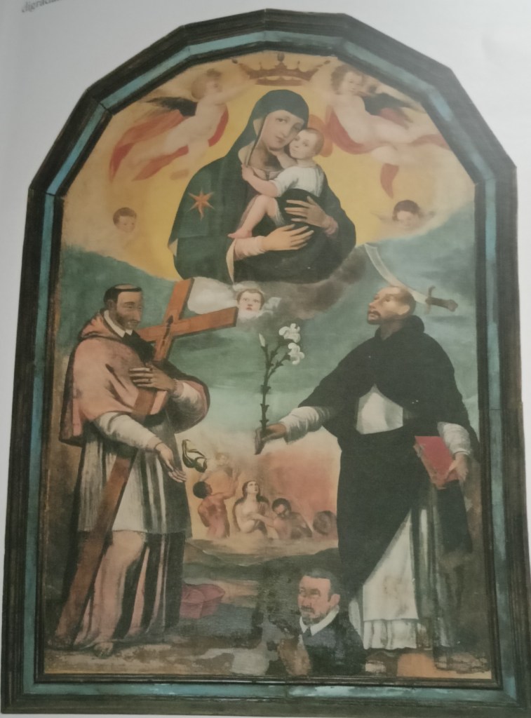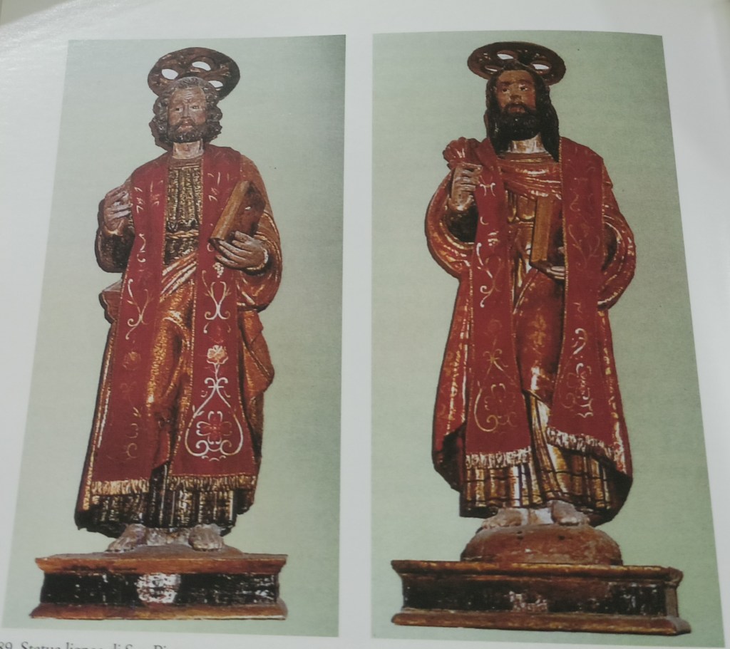 Nella foto sopra notiamo i due santi: il primo Papa è rappresentato con barba e chioma più corti mentre il suo “compagno” le ha più lunghe. Queste opere sono da datare alla seconda metà del 500, create dall’artista Altobello Peresio.