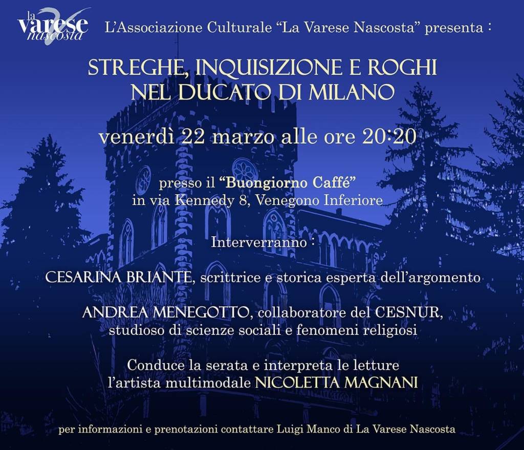Venerdì 22 Marzo si è tenuta, presso “Buongiorno Caffè” di Venegono Inferiore, una serata molto interessante focalizzata su un tema ancora poco trattato: la caccia alle streghe e la Santa Inquisizione, con un accenno particolare a quanto successo nel comune di Venegono Superiore.