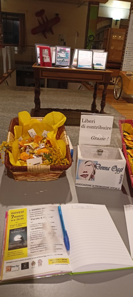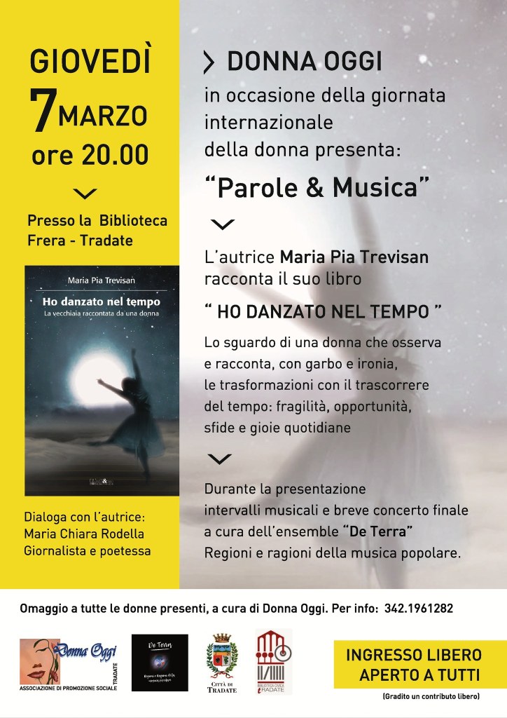 Si è tenuta giovedì 7 Marzo, vigilia della festa della Donna, la presentazione del libro di Maria Pia Trevisan: “Ho danzato nel tempo”. La serata è stata un piacevole dialogo tra la scrittrice e la giornalista Maria Chiara Rodella. Fulcro e organizzatore della serata l’Associazione Donna Oggi di Tradate, presenza attiva e supporto di tante donne tradatesi e non solo.