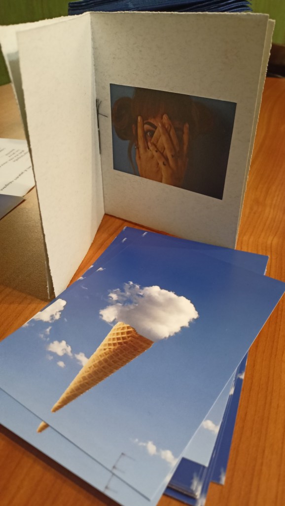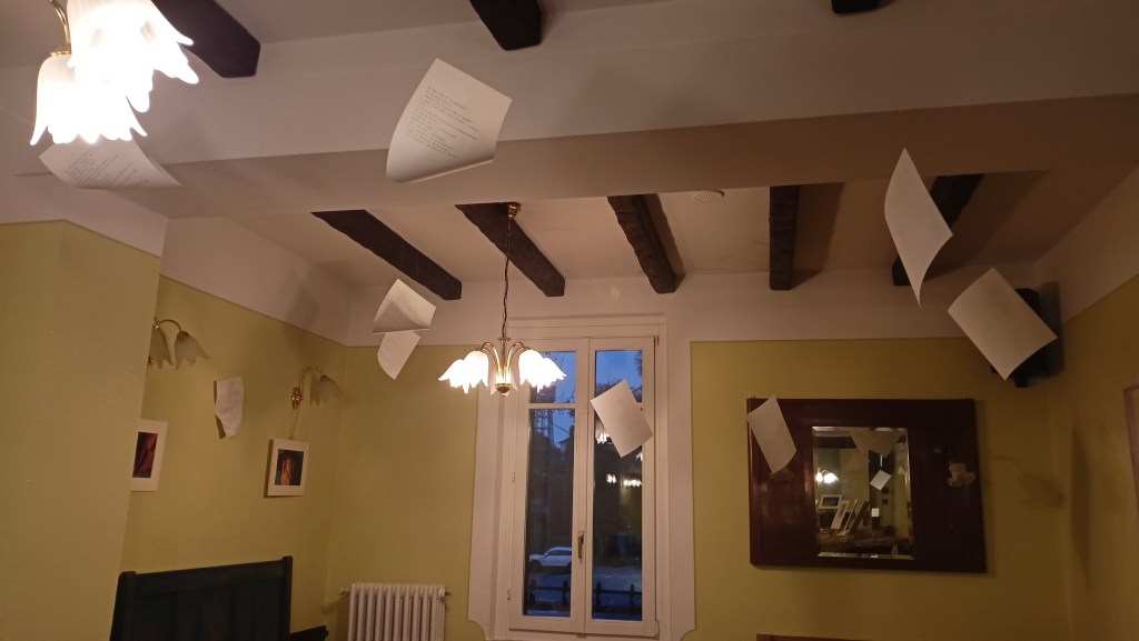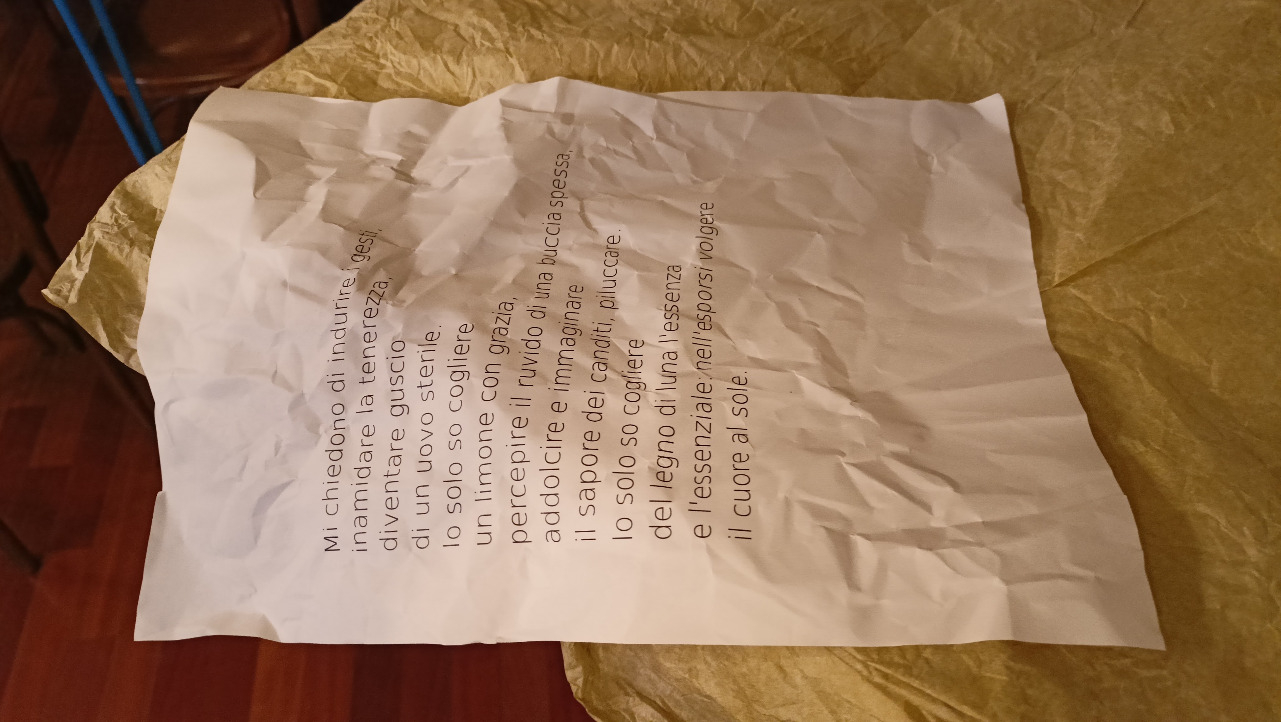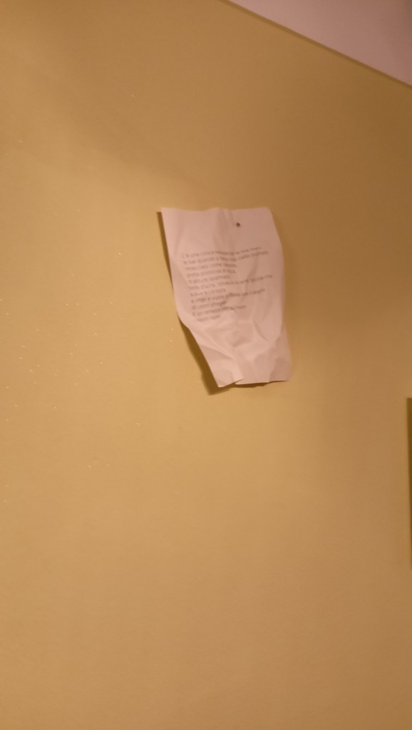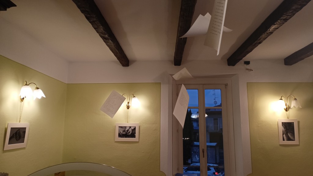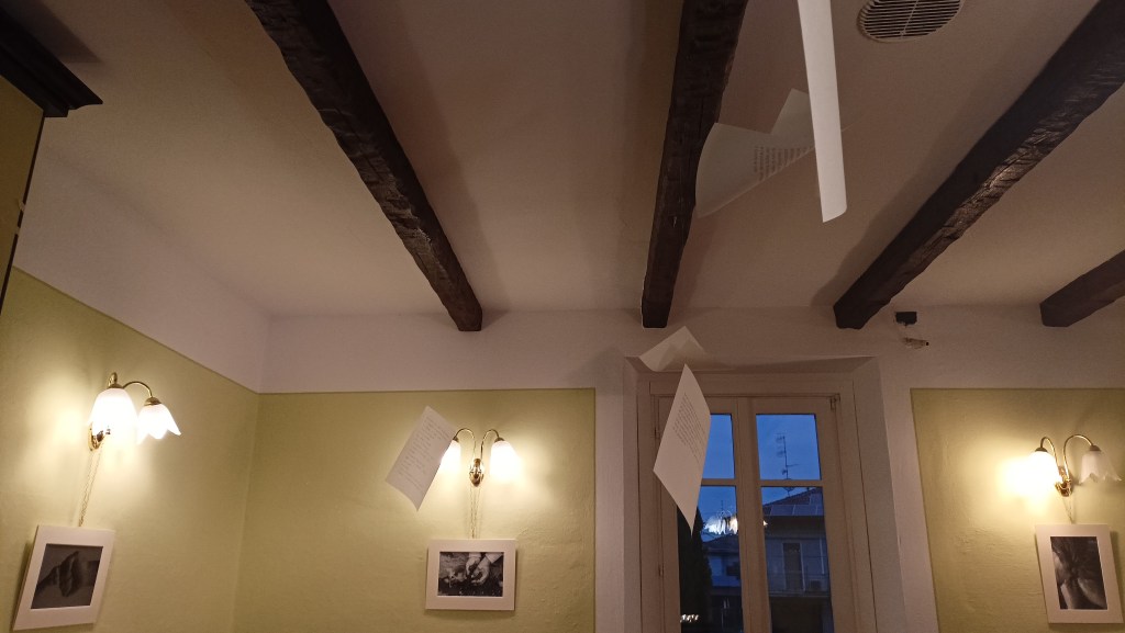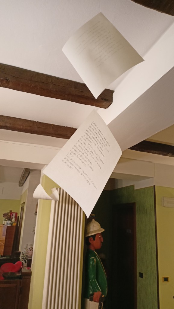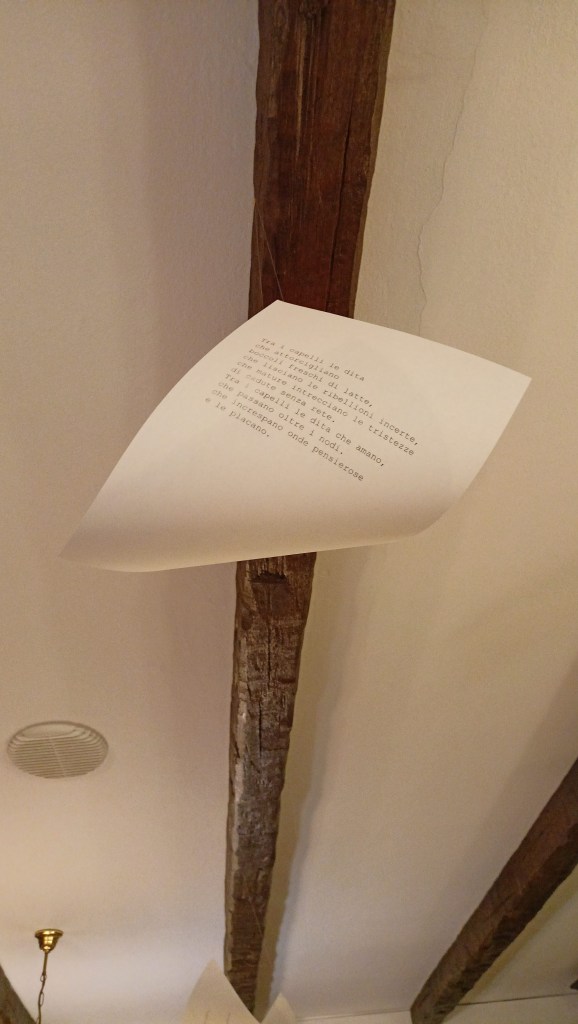 Leggendo le poesie l’anima viene scossa dalla dolcezza del suono delle parole e cullata dalla dolcezza dei fogli che quasi accarezzano il capo. I componimenti sparsi e appesi per la sala sembrano danzare al suono dei versi impressi sulla carta.
