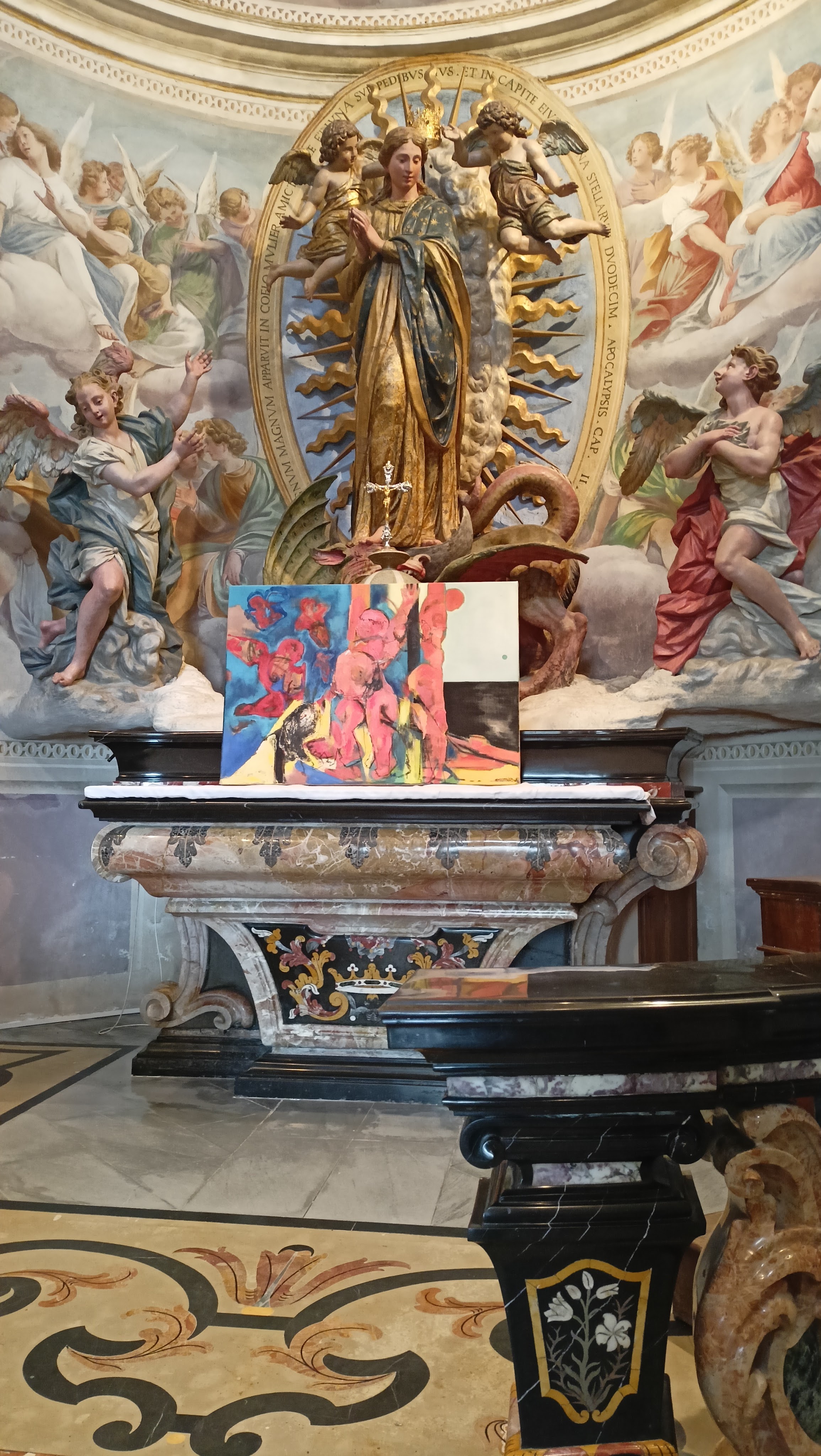 Esposta in prossimità dell’altare ai piedi della statua della Madonna, sembra raccontare un dolore profondo: infatti è l’unico quadro ad avere un accenno di sfondo nero. Tonalità che associamo alla disperazione. La Vergine, con il suo sguardo materno, delicato e angelico pare osservare il dipinto quasi con un alone di presagio. Rivedendo il suo inevitabile fato.
