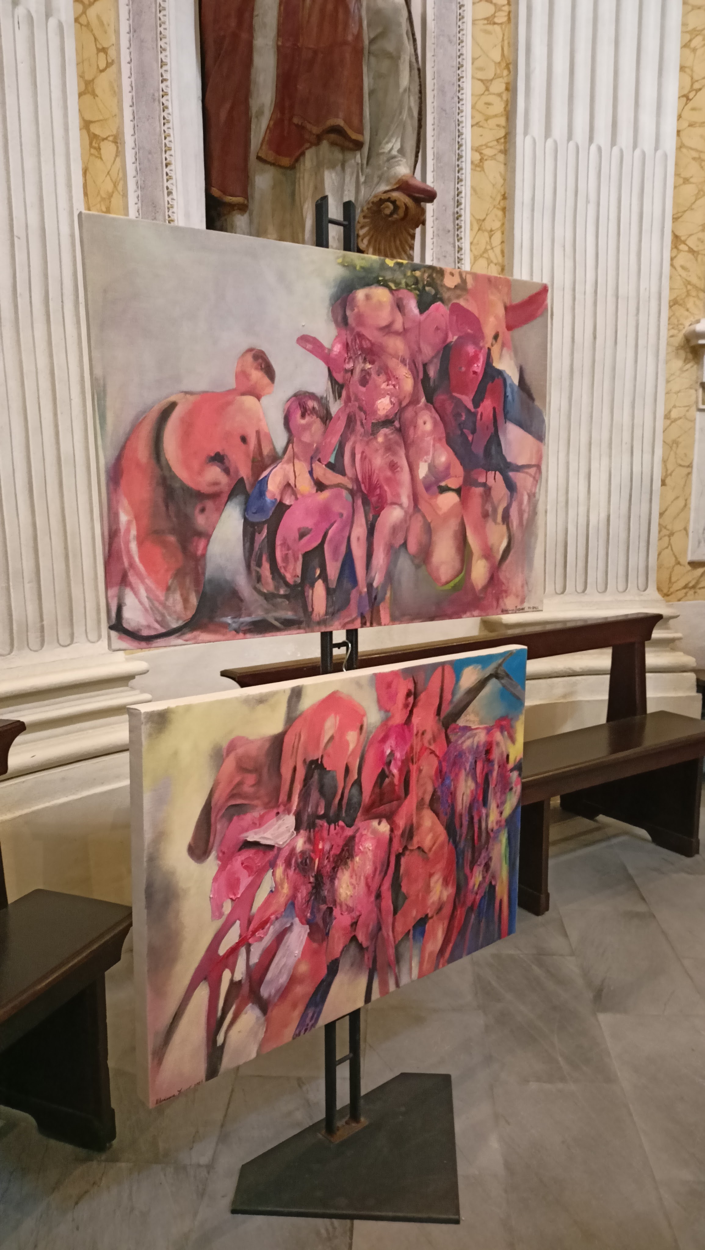 Quadri di dolore, con un rosso vivo e che scivola come il sangue dei quei dolorosi momenti della Passione. Pregni di movimento e di forme che si contorcono assieme nello strazio. Anime smarrite di fronte alla tragedia. Rinchiuse in un inferno.