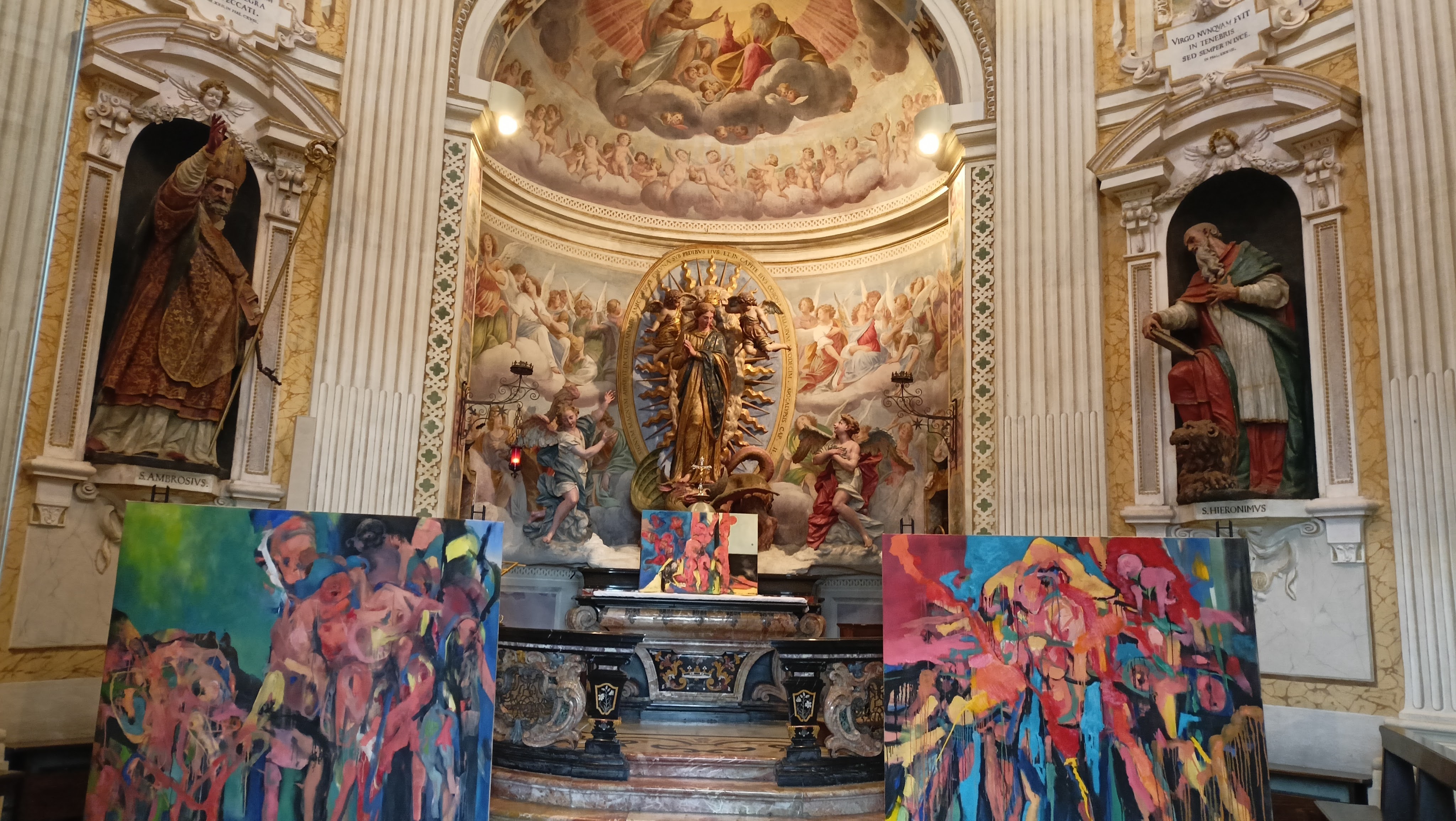 Ai piedi dell’altare, troviamo poste, ai lati, due grandi tele.