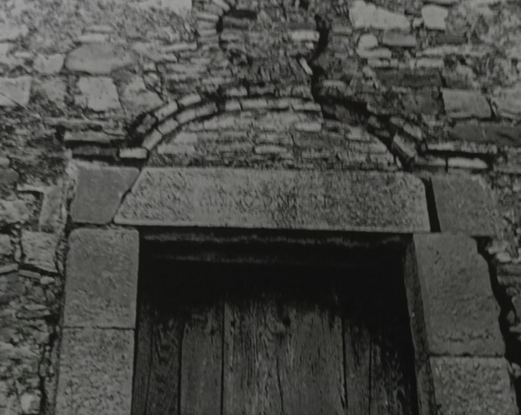 Nella parte posteriore dell’edificio, troviamo una porta sulla cui sommità sono incise delle lettere. Non sembra che esse indichino la data di costruzione dell’edificio stesso. Sembra vi siano incise semplicemente delle lettere: forse nomi dei proprietari della dimora che si sono avvicendati nei decenni. Sopra questa architrave si trova un piccolo occhio di mattoni, tamponato.