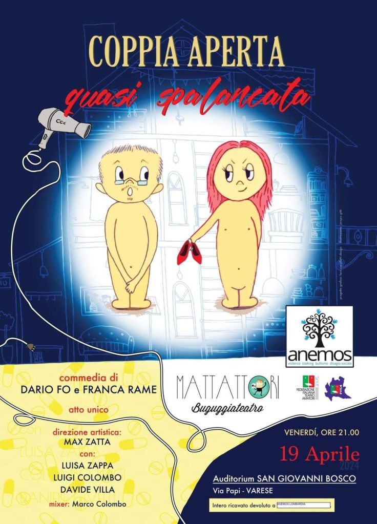Si è tenuta, venerdì 19 Aprile presso auditorium Giovanni Bosco di Varese, l’opera teatrale “Coppia Aperta, quasi spalancata” scritta da Dario Fo e Franca Rame. Una commedia magistralmente interpretata dalla compagnia teatrale Mattattori di Buguggiateatro nei panni dei coniugi Antonia e di suo marito. Una coppia,sposata da diversi anni ,deve fare i conti con un equilibrio tutt’altro che stabile.