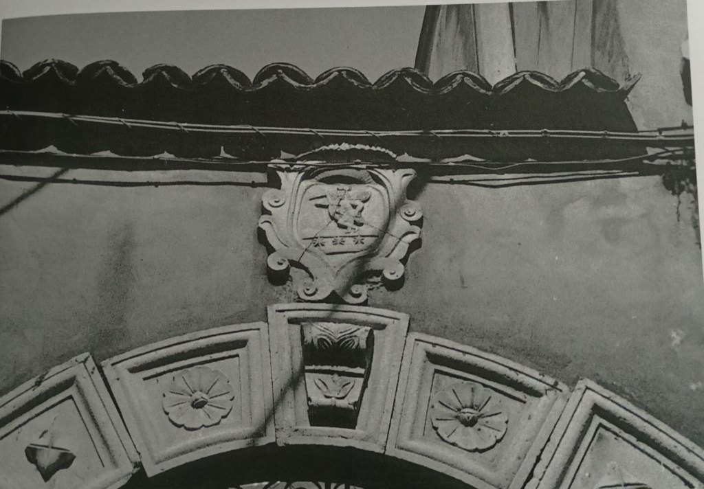 Sopra della struttura si trova lo stemma. Esso si compone di una figura alata, raffigurata di prospetto, con la gamba destra ripiegata sulla sinistra, la cui mano sul fianco sembra reggere il mantello che copre la parte centrale del corpo. Sostiene con la mano alzata una lancia.