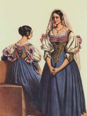 I signori indossavano completi di velluto con all’interno una tasca detta “mariole”. Le donne ricche usavano tessuti come la seta e il taffettà. Un tempo per il matrimonio gli uomini usavano vestiti neri di lana a linea diritta e stretta. Le donne ricche avevano abiti di seta color crema a metà lunghezza.
