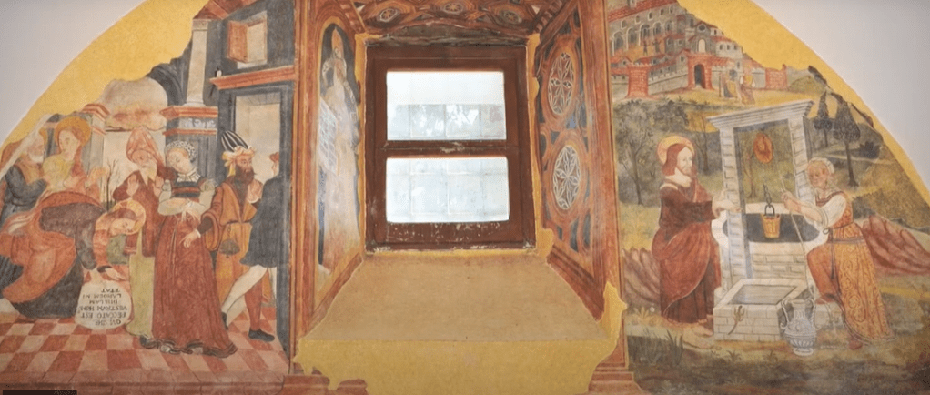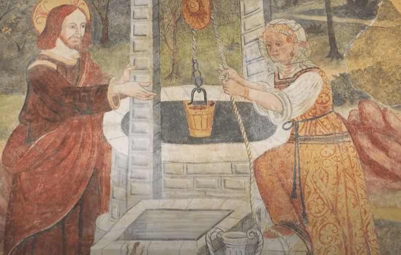 Ora analizziamo l’affresco dove viene rappresentato l’incontro tra Gesù e la Samaritana presso il pozzo di Giacobbe. La donna sta tirando la carrucola il secchio pieno d’acqua