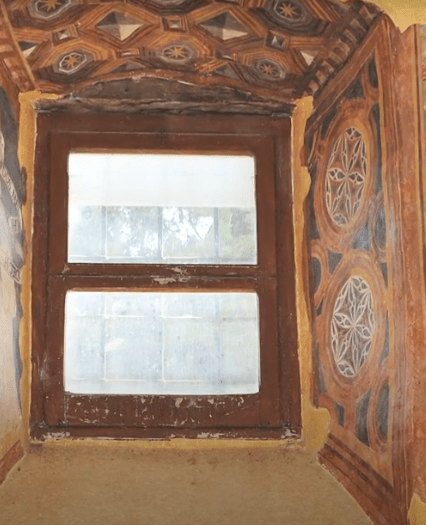 Notiamo poi che il sottarco e lo sguincio di destra sono decorati da motivi a falso cassettonato. Questo tipo di decorazione rappresenta una perfetta illusione ottica che crea profondità alla rappresentazione stessa.