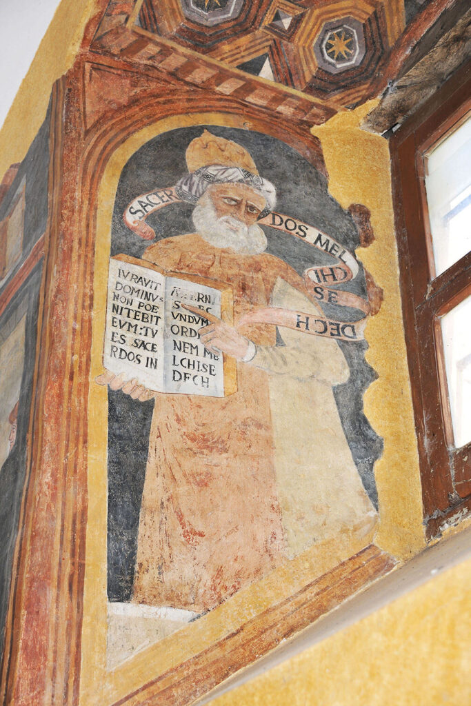 Alla destra di questo affresco troviamo Melchisedech, che tiene un libro aperto al salmo 109.