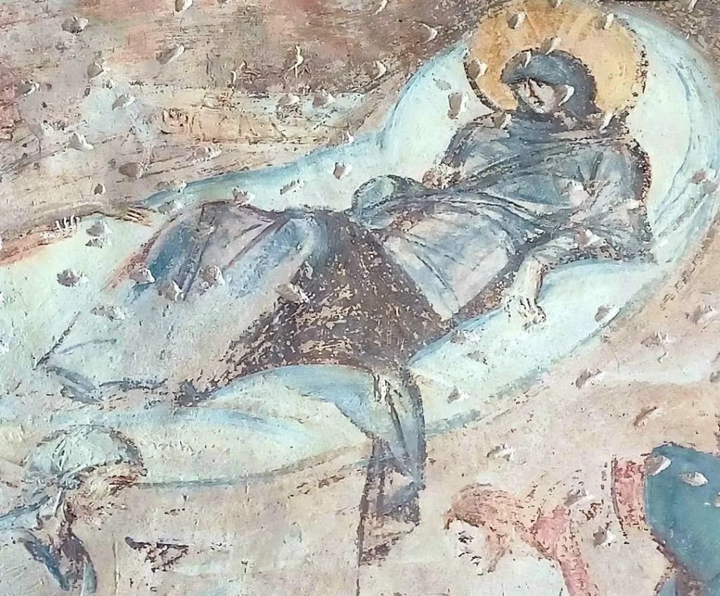 Meravigliosa l’immagine della vergine che si riposa dopo il parto mentre le levatrici lavano il bambino. Secondo la tradizione dei vangeli apocrifi, una di esse dubitò della verginità di Maria e il braccio gli fu tranciato di netto.