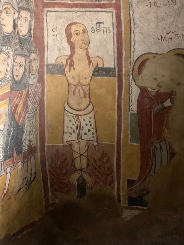 Sono infatti rappresentanti i due ladroni: a differenza delle rappresentazioni più classiche, sono dipinti ai lati della crocifissione e non assieme.