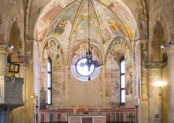 La scelta del Battistero, collocato a ridosso della Chiesa, venne indirizzata verso un edificio attiguo e già consacrato. Una struttura semplice, di pianta quadrata e di modeste condizioni. Branda Castiglioni decise di farla affrescare da Masolino da Panicale con l’intento di rappresentare le vicende legate a San Giovanni Battista.