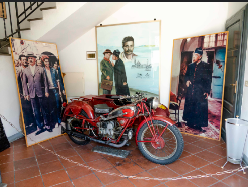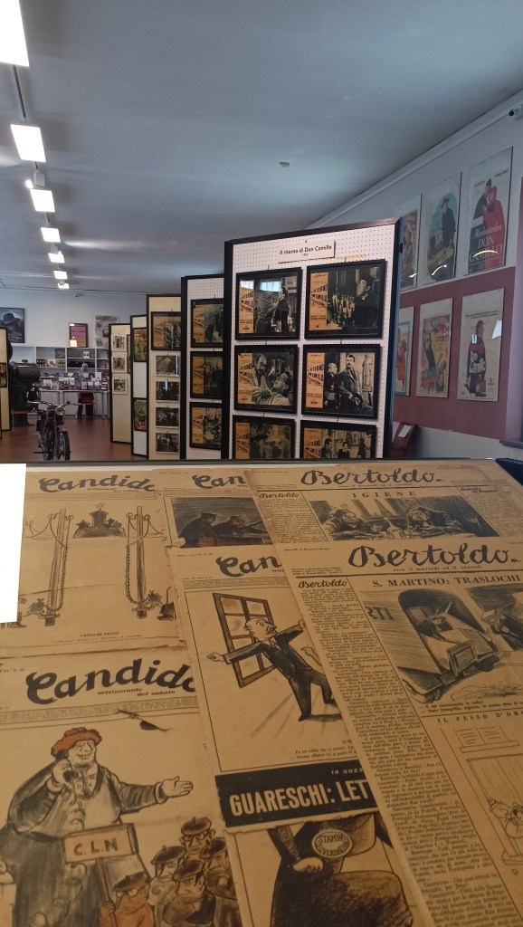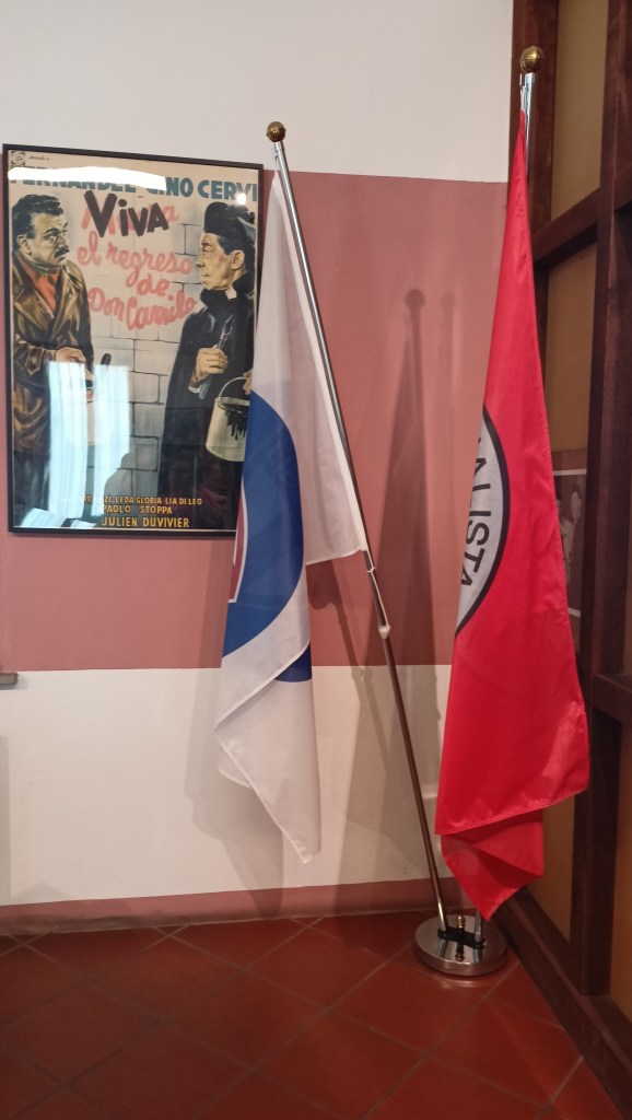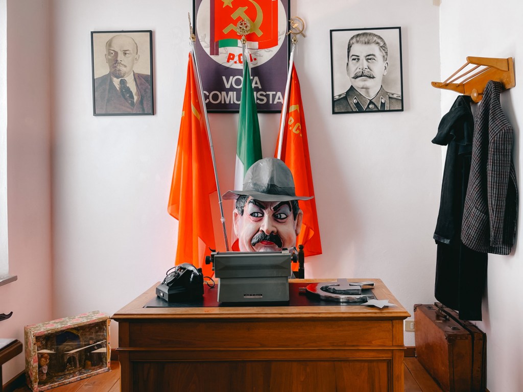 Lo stesso ufficio di Peppone viene fedelmente riprodotto in scala reale, attorniato da quelli che erano i suoi eroi e dove rimbomba, quasi come un’urlo di orgoglio, la sua fede rossa che tanto faceva arrabbiare Don Camillo.