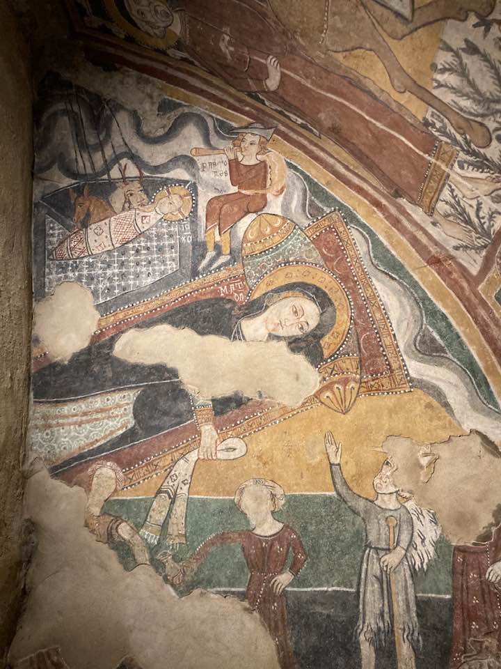Sullo sfondo gli angeli e i pastori celebrano il momento grandioso. Dei loro volti, con buona probabilità gioiosi e festanti, non è rimasta traccia.