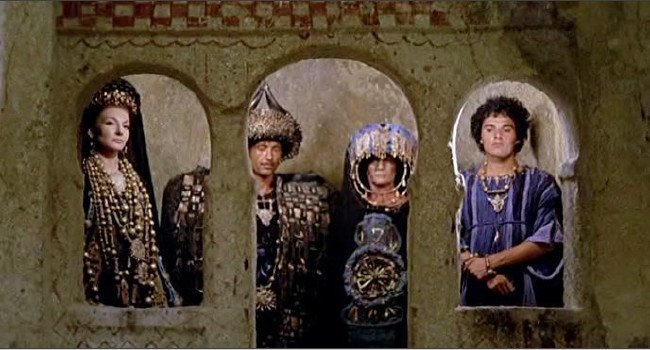 In quest’opera di Pasolini, forse una delle più note, la tragedia prende vita e dolore. Produzione che si svolse tra la Turchia, la Grecia e l’Italia che vide impegnate molte maestranze locali e una assoluta precisione e ricostruzione dei costumi dell’epoca, in particolare quelli della protagonista.
