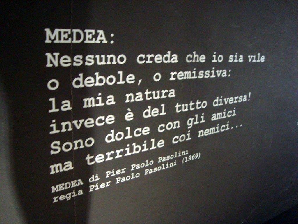 Antieroina per eccellenza, da molti considerata il male e la vendetta resa a persona. Scavando a fondo però, sia il personaggio creato dal genio immortale di Euripide che quello generato dalla regia di Pasolini, scopriamo che la principessa della Colchide è molto di più: una ribellione cieca e senza freno ad un destino abietto e ingiusto. Forza d’impeto incontenibile e quasi animale, che non si piega a nulla.