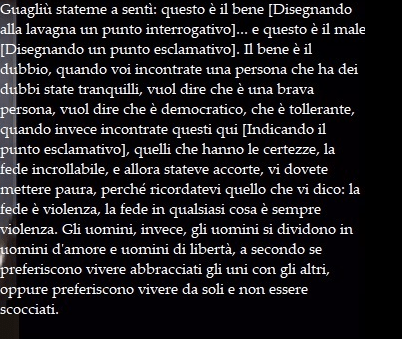 Come si fa a capire quando uno è stoico e quando uno è epicureo? È una cosa semplicissima: gli stoici amano i grandi obiettivi posti al di là della vita e per questi obiettivi loro sono disposti a morire […]. I cristiani sono stoici, eh sì, perché i cristiani che cosa vogliono? Vogliono la felicità eterna e come dicono i cristiani: siamo nati per soffrire. […] I marxisti sono stoici perché vogliono la giustizia per tutti e per questa giustizia sono disposti a sopportare la dittatura del proletariato e la rivoluzione, che detto tra di noi sono cose scomodissime. Cazzaniga è stoico, si alza alle sei e mezza alla mattina perché vuole diventare direttore generale dell’Alfa Romeo. Noi no, noi siamo epicurei, noi ci accontentiamo di poco, purché questo poco ci venga dato al più presto possibile.