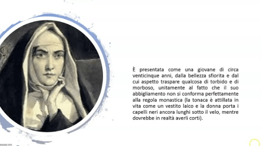 Nella sua grandiosa opera, Manzoni la descrive con la tonaca attillata e i capelli lunghi.