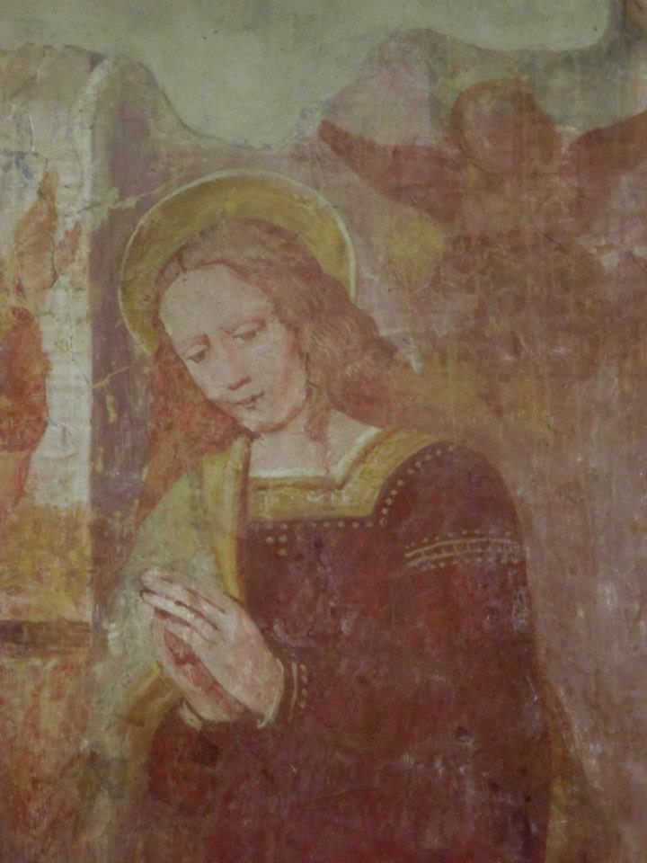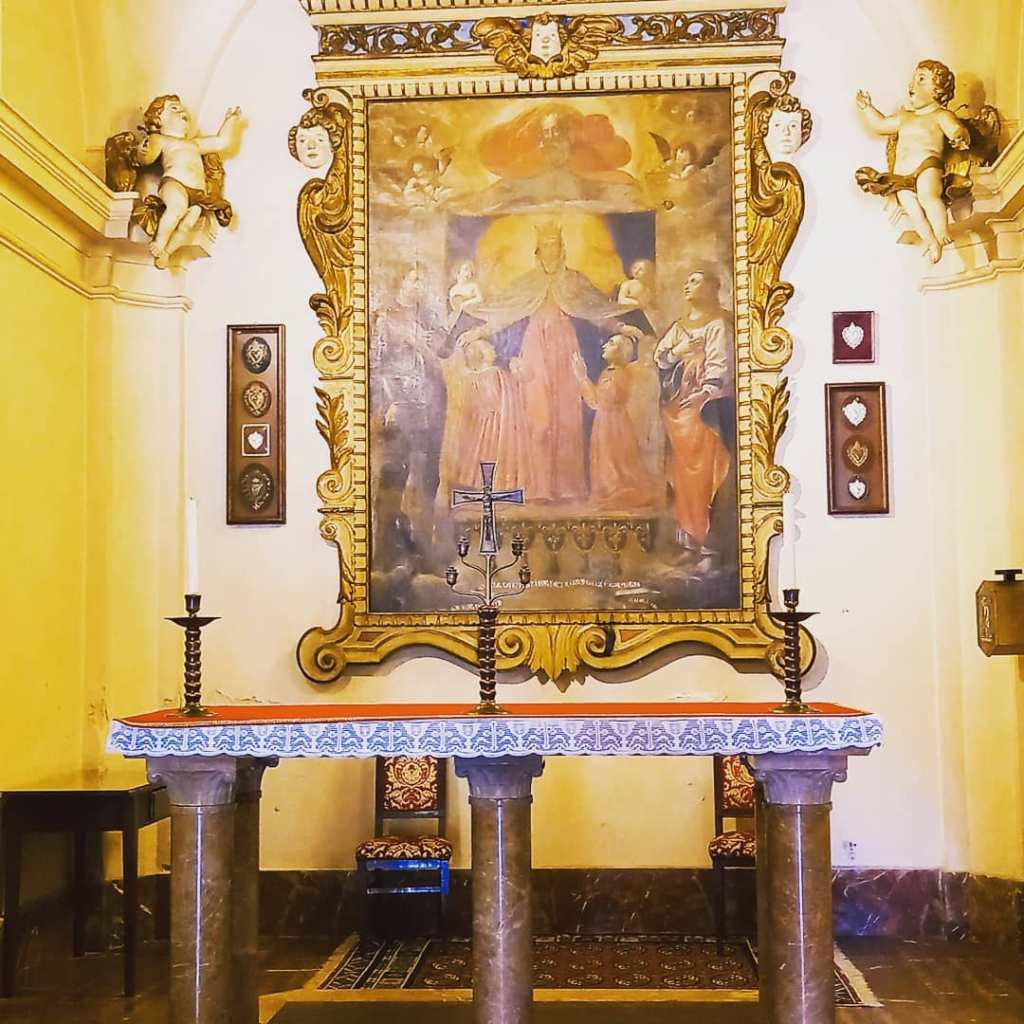 Una menzione particolare va alla pala d’altare, collocata in una cornice barocca con volute e putti. La tela raffigura la Vergine Maria con Santa Apollonia.