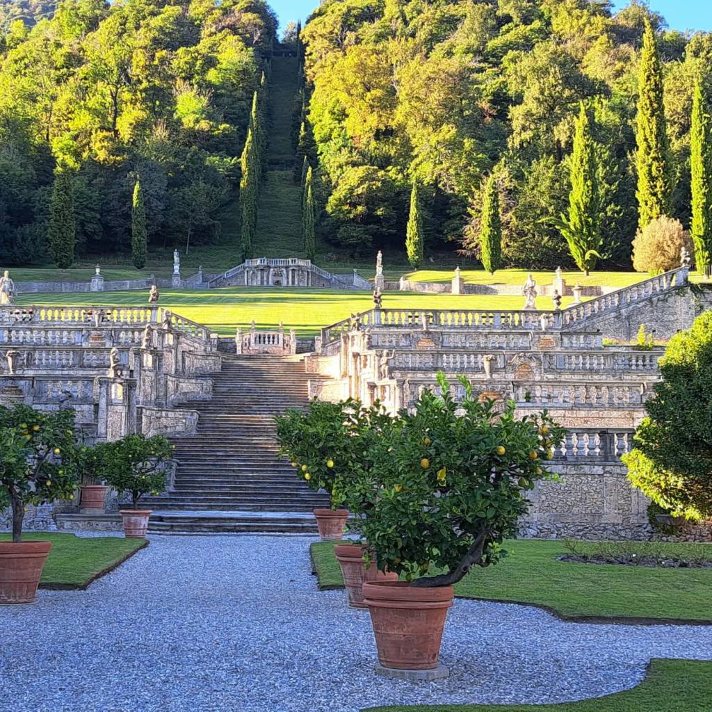 Oltre ai suggestivi interni, è possibile ammirare lo straordinario e scenografico parco all’italiana, opera dell’architetto Antonio Maria Porrani. Ornato da eleganti terrazze scolpite in pietra che risalgono la collina fino al grande prato verde, fontane, giochi d’acqua e il cosiddetto “giardino segreto”: uno spazio più raccolto e meditativo con un viale alberato che conduce ad un’edicola dipinta raffigurante il mito di “Apollo e le Muse”.