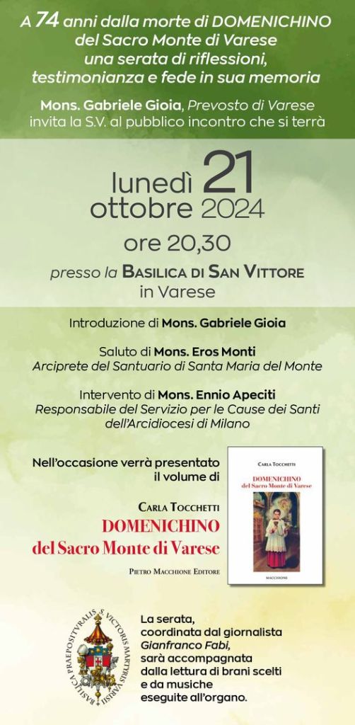 La storia di Domenichino del Sacro Monte è una pagina preziosa della comunità varesina, oggetto di un mio articolo, e di cui sono venuta a conoscenza grazie al prezioso e puntuale impegno della giornalista e divulgatrice culturale Carla Tocchetti, autrice di piu’ di 200 articoli di storia locale e del Sacro Monte sul quotidiano La Provincia di Varese, prima della chiusura,con una predilezione per le storie “minori”.