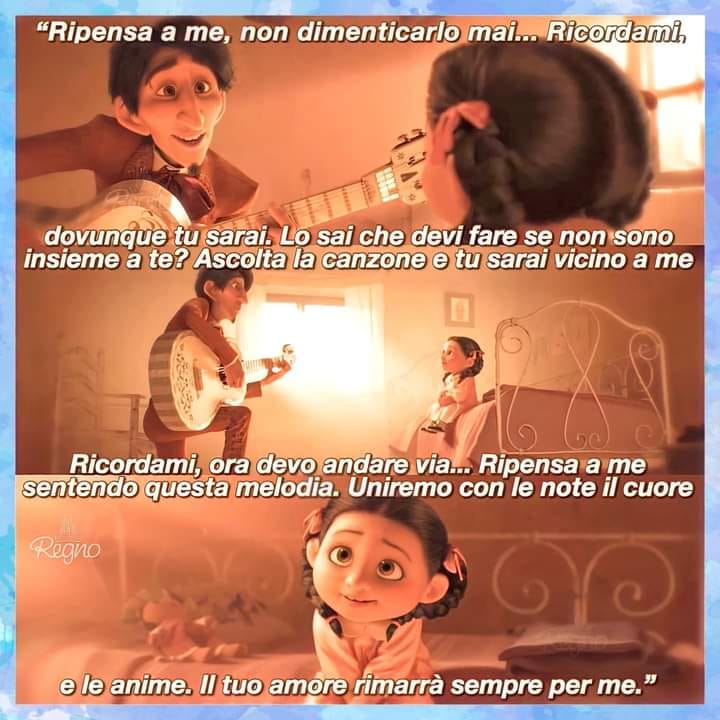 Mi sento vittima di un sortilegio, un castigo che risale a prima che io nascessi: ecco, tanto tempo fa c’era una famiglia. Il papà era un musicista, tutti insieme cantavano, ballavano, la vita gli sorrideva. Ma egli aveva un sogno: suonare in tutto il mondo, così un giorno partì con la sua chitarra e non torno più. E la mamá non aveva tempo per piangere quel musicista giramondo. Dopo aver bandito tutta la musica dalla sua vita trovò il modo di mantenere sua figlia. Si rimboccò le maniche e imparò a fabbricare scarpe. avrebbe potuto creare dolciumi, o fuochi d’artificio, o costumi da lottatore luccicanti, ma no, lei scelse le scarpe. Poi insegnò il mestiere a sua figlia e in seguito anche al suo genero e finì per coinvolgere i nipoti, e più cresceva la famiglia più crescevano gli affari, la musica aveva lacerato la mia famiglia ma le scarpe l’avevano unita, ecco, quella donna era la mia trisnonna, mamá Imelda, morì molto prima che io nascessi, ma la sua storia viene tramandata ogni anno durante il “Dia de los Muertos”, il giorno delle anime, e quella bambina è la mia bisnonna, mamá Coco.