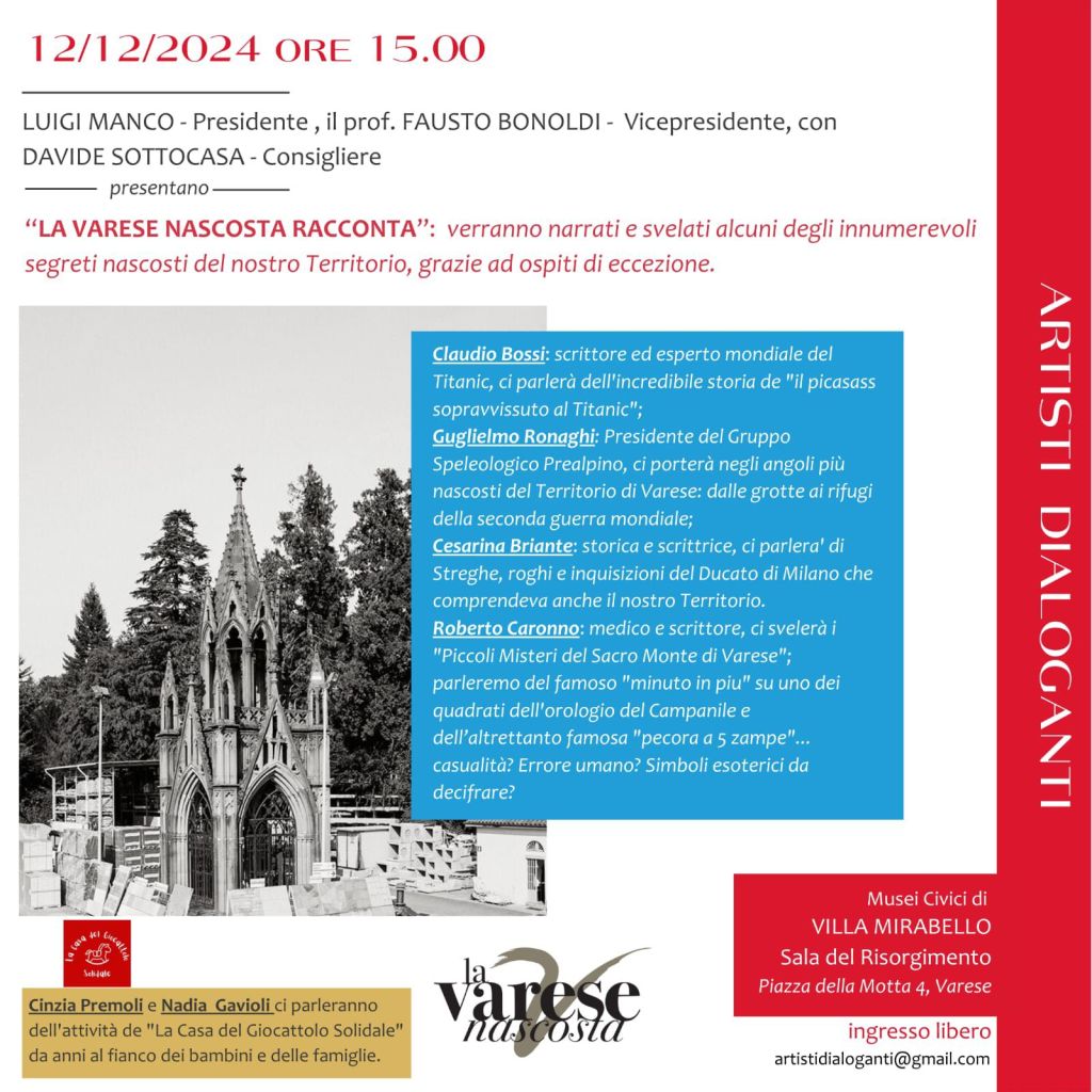 Il 12 dicembre alle ore 15.00, a Varese, presso la Sala Risorgimento di Villa Mirabello, La Varese Nascosta, nell’ambito dell’iniziativa “Artisti Dialoganti”, parlerà proprio di Streghe, Roghi e Inquisizioni del nostro Territorio. Con la partecipazione proprio di Cesarina. Briante