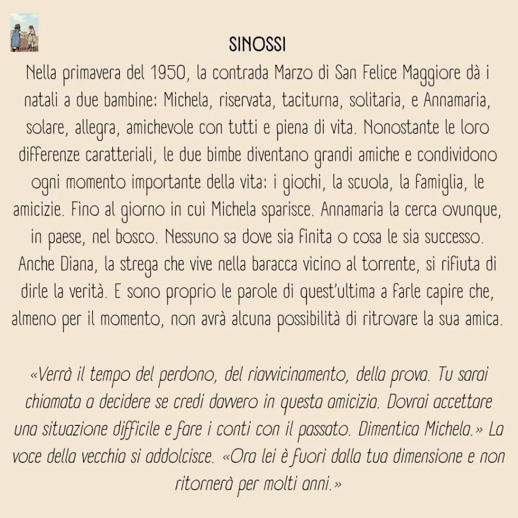 Questo libro pare, apparentemente, raccontare la vita di due giovani: Michela e Annamaria. Diverse ed eppure unite da un filo invisibile. Un legame d’amicizia molto forte e che sopravvive a tutto. Anime gemelle in simbiosi d’unione affettiva e devota, resiliente ed eterna.