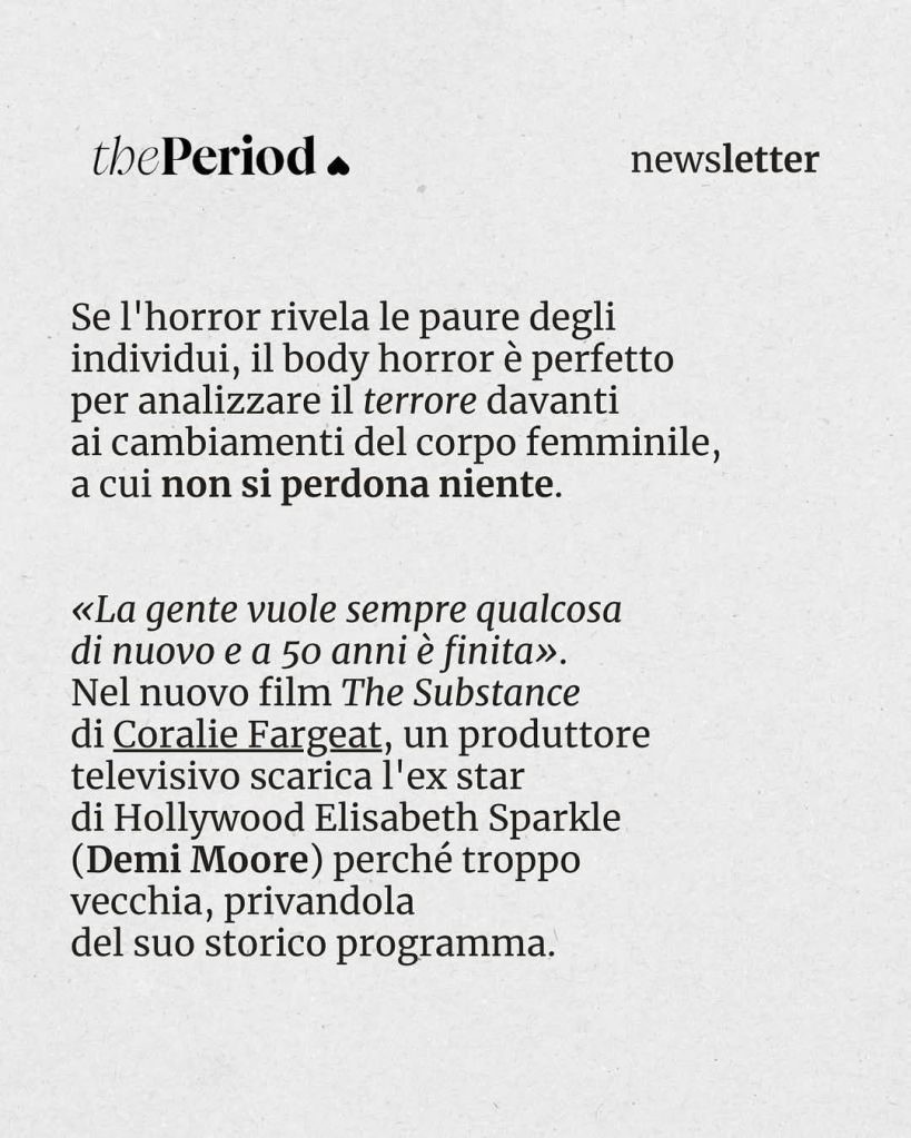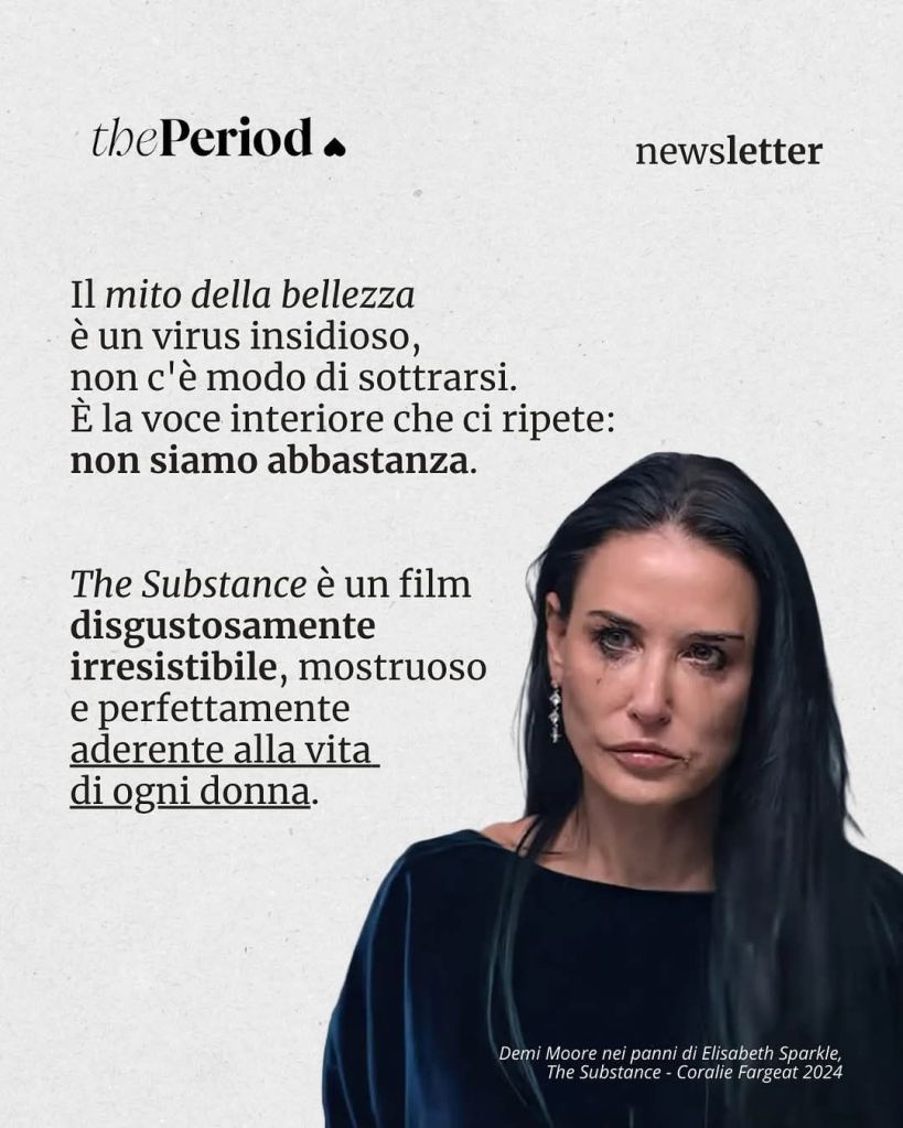 Lo scandaloso nuovo horror The Substance, diretto da Coralie Fargeat e interpretato da Demi Moore e Margaret Qualley, uscito qualche mese fa dopo aver vinto a Cannes 2024 il premio per la miglior sceneggiatura, è uno degli ultimi prodotto più straordinari che abbia mai visto.