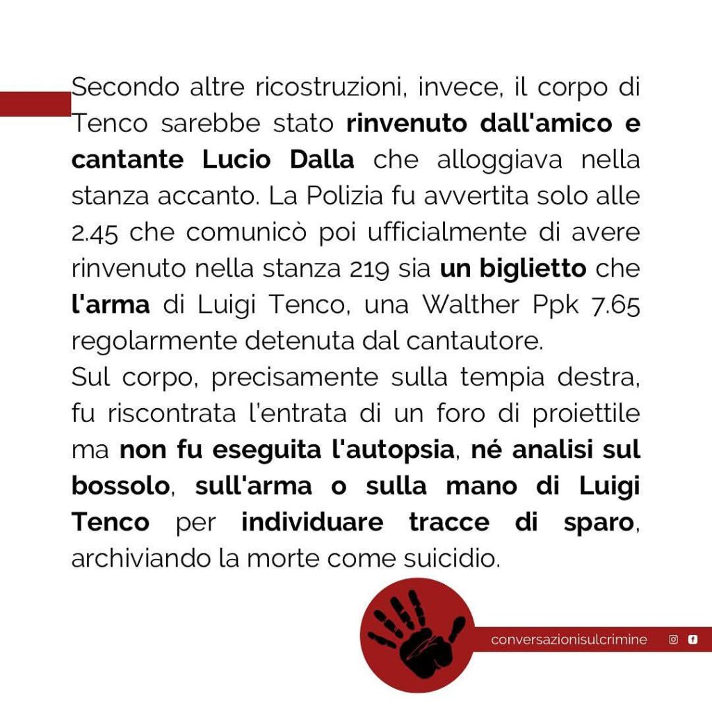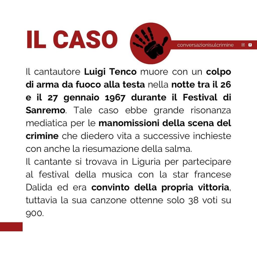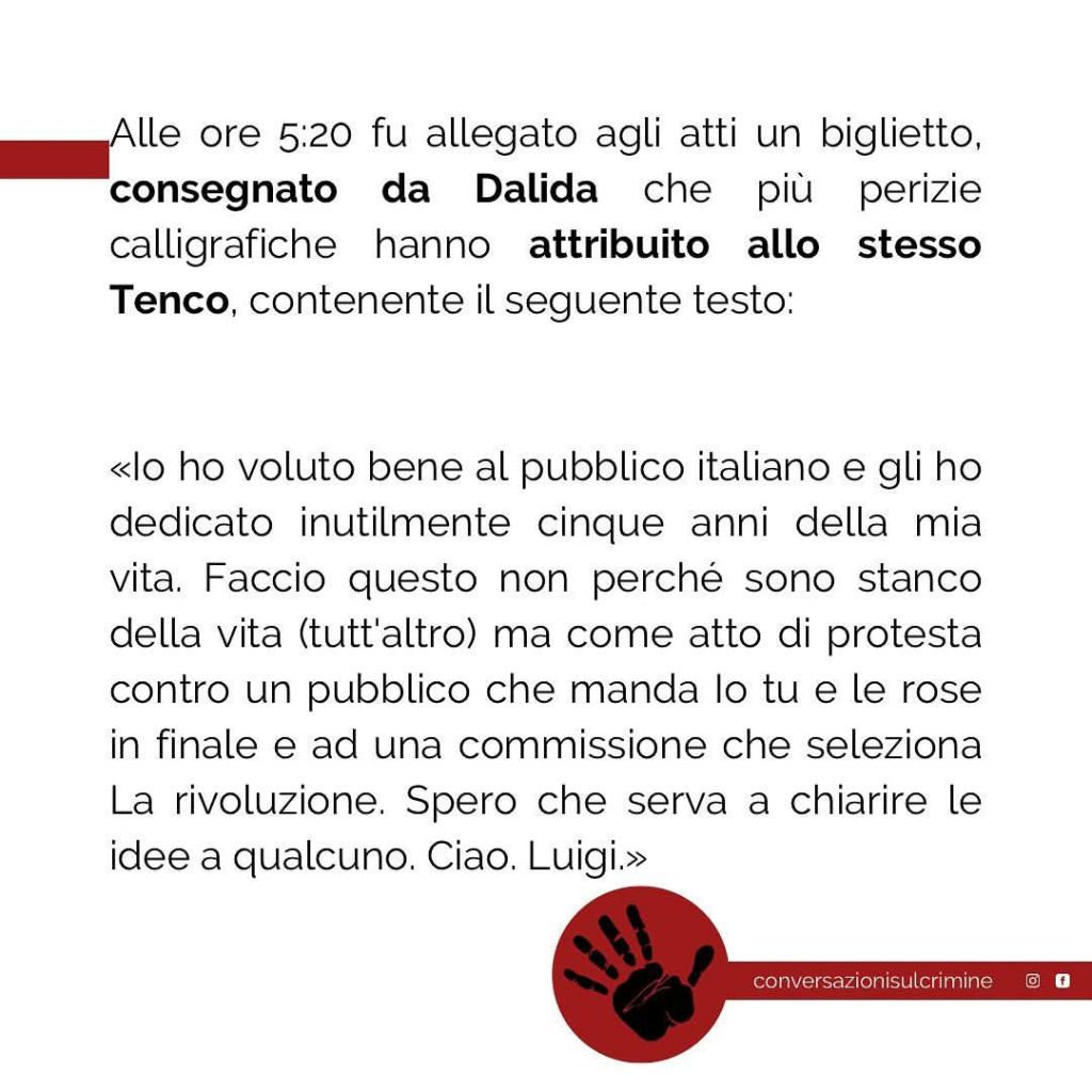A differenza di chi disse, sempre sul palco dell’ Ariston, che Tenco giocava con la pistola, si trattò di un suicidio.