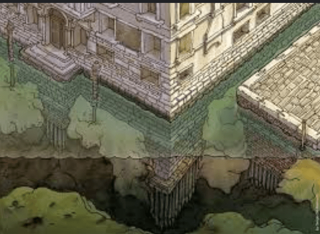 Praticamente la città poggi su dei tronchi cementificati che permettono di rimanere stabile e non essere sommersa dall’acqua.