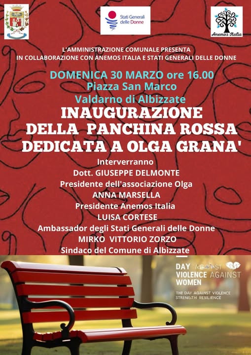 Attraverso il lavoro capillare e sinergico di Anemos con la condivisione dell’Associazione Olga di cui Giuseppe Delmonte è presidente, e il supporto dell’amministrazione comunale è stato possibile porre una panchina nel paese dove Olga aveva trovato dimora assieme agli adorati figli.