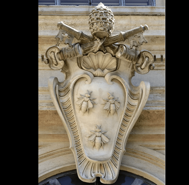 Sulle due facce esterne di ciascun piedistallo è scolpito su marmo bianco lo stemma del Pontefice: formato da uno scudo con tre api a bassorilievo sormontato dalle chiavi incrociate e dalla tiara (corona papale)