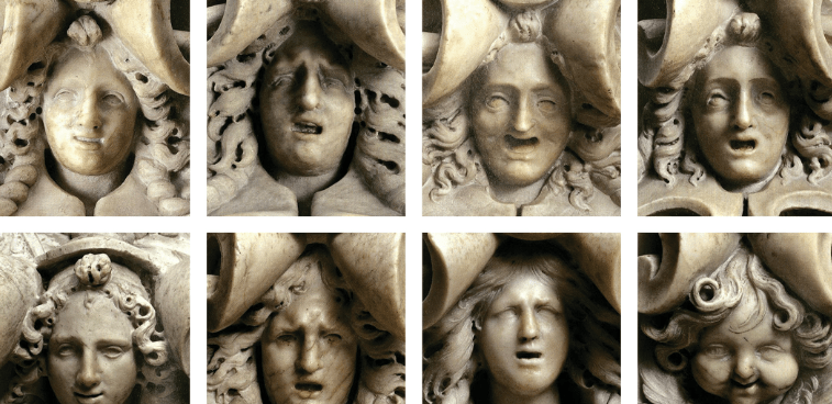 Il volto femminile inizialmente si contrae per le prime doglie, quindi gli occhi si stravolgono, i capelli sono scompigliati, la bocca da socchiusa si apre in un urlo. Nell’ottavo e ultimo stemma la testa di donna è sostituita da quella allegra e paffuta di un bambino, anzi – a giudicare dalle ali – di un cherubino, a significare che il travaglio si è concluso felicemente, con la nascita di una nuova vita.