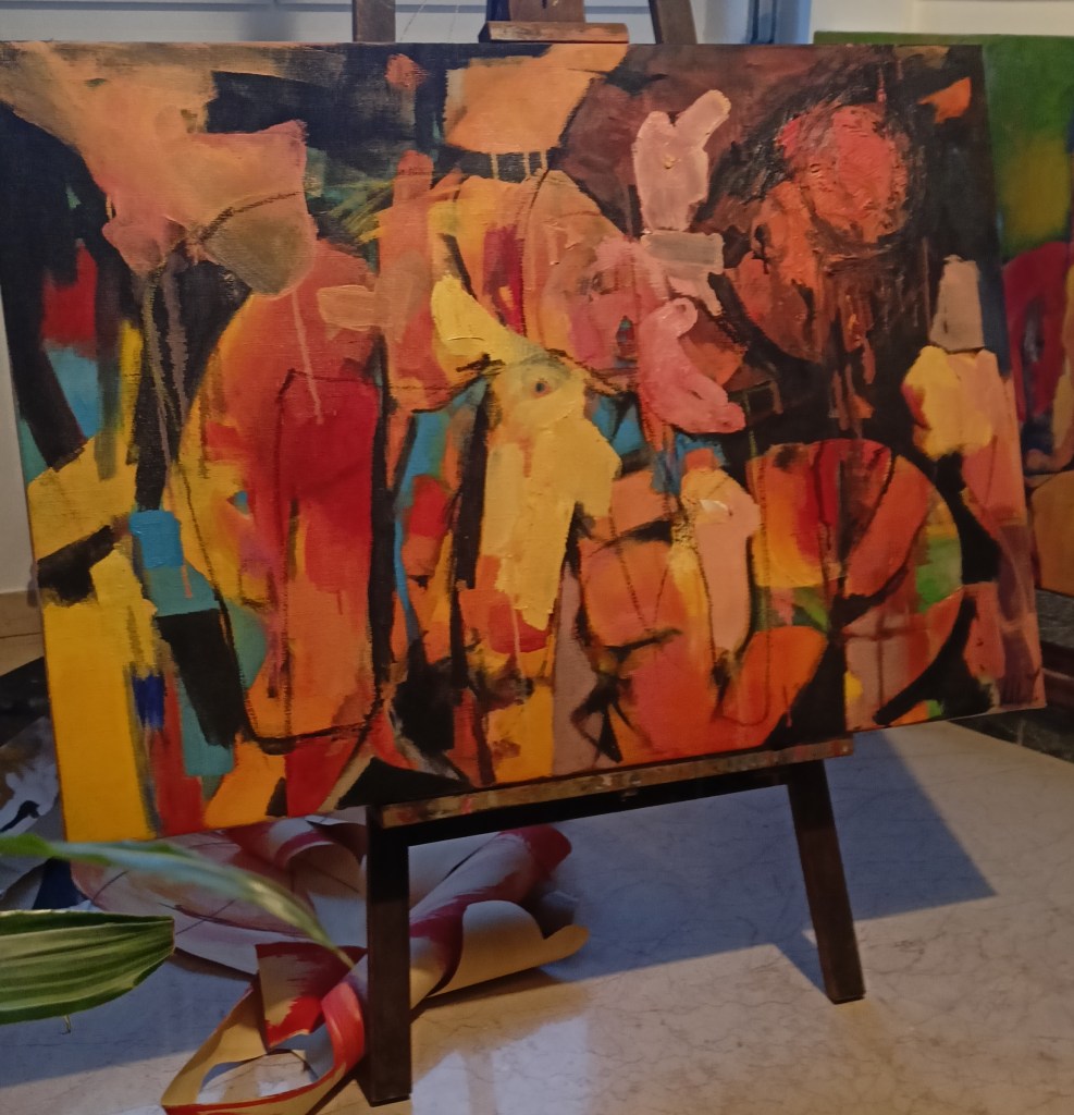 E’ stata una sfida che ha colpito profondamente la mia anima. Uno spettacolo teatrale dove il dolore di una madre veniva ritratto con le mie opere fatte sul momento. Una fusione di arte, sentimento e teatro totalizzante e intensa. Esperienza magnifica e che mi ha fatto immergere in una realtà artistica e poliedrica. Anche in questo caso i miei lavori erano creati in divenire. Nella drammaticità della scena essi erano la rappresentazione di un dolore talmente sordo e lancinante che solo l’arte poteva rappresentarlo. Un ruolo quasi scomodo: vate del dolore, ma necessario per comprendere appieno l’incomprensibile.