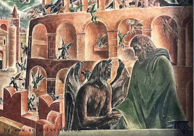 Mentre i demoni, sotto il comando del diavolo, lavoravano freneticamente per innalzare l’edificio, l’uomo si pentì del patto scellerato e pregò la Vergine Maria. La preghiera fu ascoltata e, al primo canto del gallo, una luce divina fermò i diavoli, lasciando l’Arena incompiuta, senza il suo anello esterno.