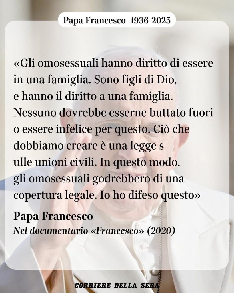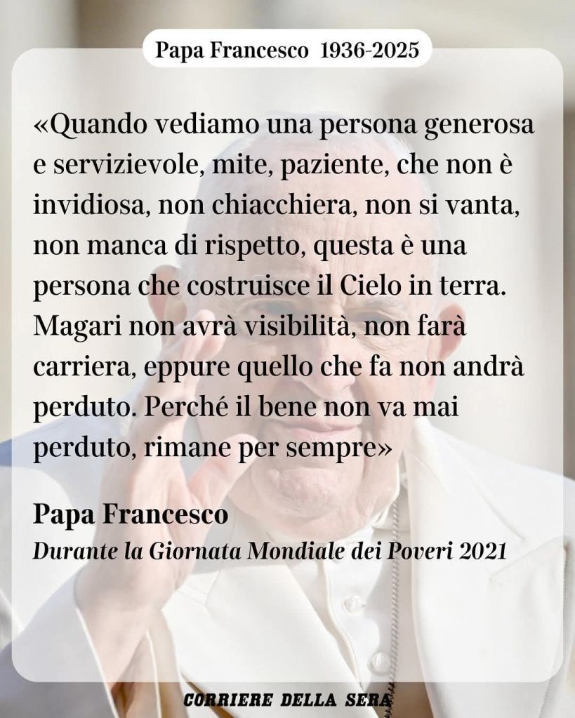 Il Pontefice aveva 88 anni. Il 25 dicembre 2024 Papa Francesco ha inoltre aperto la Porta Santa della basilica di San Pietro, dando ufficialmente inizio al Giubileo della Speranza. Un evento fortemente voluto, vissuto come messaggio di rinascita per la Chiesa e per il mondo.