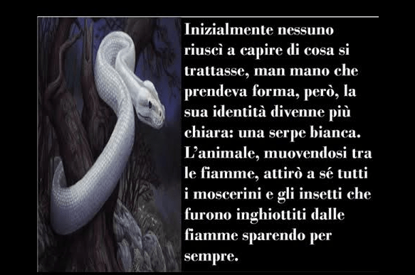 Solo dopo che il mago invocò un essere luminoso e ardente, la cui luce e il calore attirarono e bruciarono tutti gli insetti, la gente iniziò a venerare la serpe bianca come simbolo di protezione.
